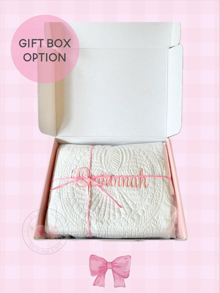 If you choose to add a gift box, your order will be carefully packaged in a clear protective sleeve, then wrapped with coordinating ribbon & placed in a perfectly sized gift box. You can choose to include a gift message and I will tuck that into the gift box as well. The gift box will ship inside another gift box for safe keeping. PRICE INCLUDES GIFT BOX AND ADDITIONAL SHIPPING FEES ASSOCIATED WITH THE LARGER PACKAGE.